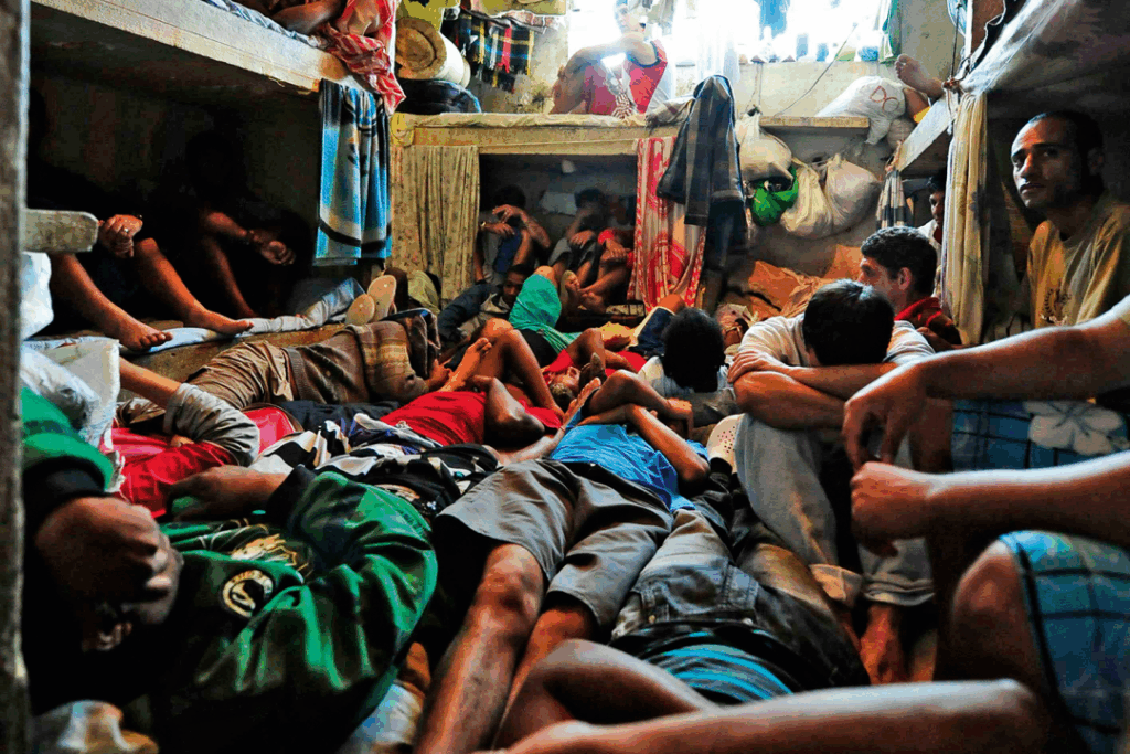 A situação dentro dos presídios brasileiros é a pior possível, um verdadeiro campo de concentração legalmente instituído. As celas são superlotadas, chegando em alguns estados a superar a capacidade de ocupação em 100%! O País tem um deficit de 174 mil vagas, segundo o Relatório de Informações Penais. A superlotação se soma a problemas estruturais, como infiltrações e redes de esgoto inadequadas, falta de água, ventilação, iluminação e materiais de limpeza, os quais tornam quase impossível a manutenção mínima da higiene das selas, tornando-as um ambiente de insalubridade generalizada e situação de proliferação de vetores infectocontagiosos que debilitam a saúde dos presos, já sob forte tensão de sua condição mental, como tuberculose e outras doenças. Há casos, não raros, em que a superlotação é tão grave que os presos precisam fazer rodízio de sono, um aviltamento total à vida humana e aos direitos do povo. Isto para não falar de outros casos extremos, como os eventos medonhos em que o desespero ante situação tão infra-humana conduzem os próprios presos a elegerem dentre os mesmos quais serão esganados até a morte, como a “ciranda da morte” em Belo Horizonte-MG, ou as degolas e lançamentos das alturas do topo, do presídio Urso Branco em Porto Velho-RO, e das rebeliões reprimidas com selvageria, como a ignominiosa chacina de 111 presos do Carandiru, na capital paulista. Além disso, a comida quando não é feita pelos próprios presos, muitas vezes são servidas estragadas. O banho de sol de duas horas diárias pode ser restringido pela administração carcerária diante de qualquer mínima alteração da rotina, usado como medida disciplinar ou mesmo chantagem e vingança. Ou mesmo isolamento individual, onde o preso fica sem nenhuma comunicação, sem luz e na maioria das vezes até sem colchão e com a alimentação restrita. É um método corriqueiro de tortura, que pode durar meses. Os agentes penitenciários e a direção dos presídios são cruéis no tratamento com os presos, esculacho, maus-tratos como surras, restrição da alimentação, ameças de corte nas visitas, enfim várias formas perversas no trato coletivo e individual. Não somente as várias formas de tortura, mas inclusive assassinatos, são uma realidade cotidiana. Para piorar, muitas destas medidas podem ser aplicadas ao bel prazer sádico de agentes e membros da administração das carceragens, que manipulam informações, e as denúncias dos presos e presas sobre estes crimes não têm nenhuma consequência. Ademais, o próprio ócio e o isolamento total são também tipos de tortura. Ferem normas e as convenções internacionais que o Estado Brasileiro é signatário, não respeitando nem mesmo suas próprias leis, violando constantemente e em grande escala os direitos fundamentais das pessoas presas e seus familiares.